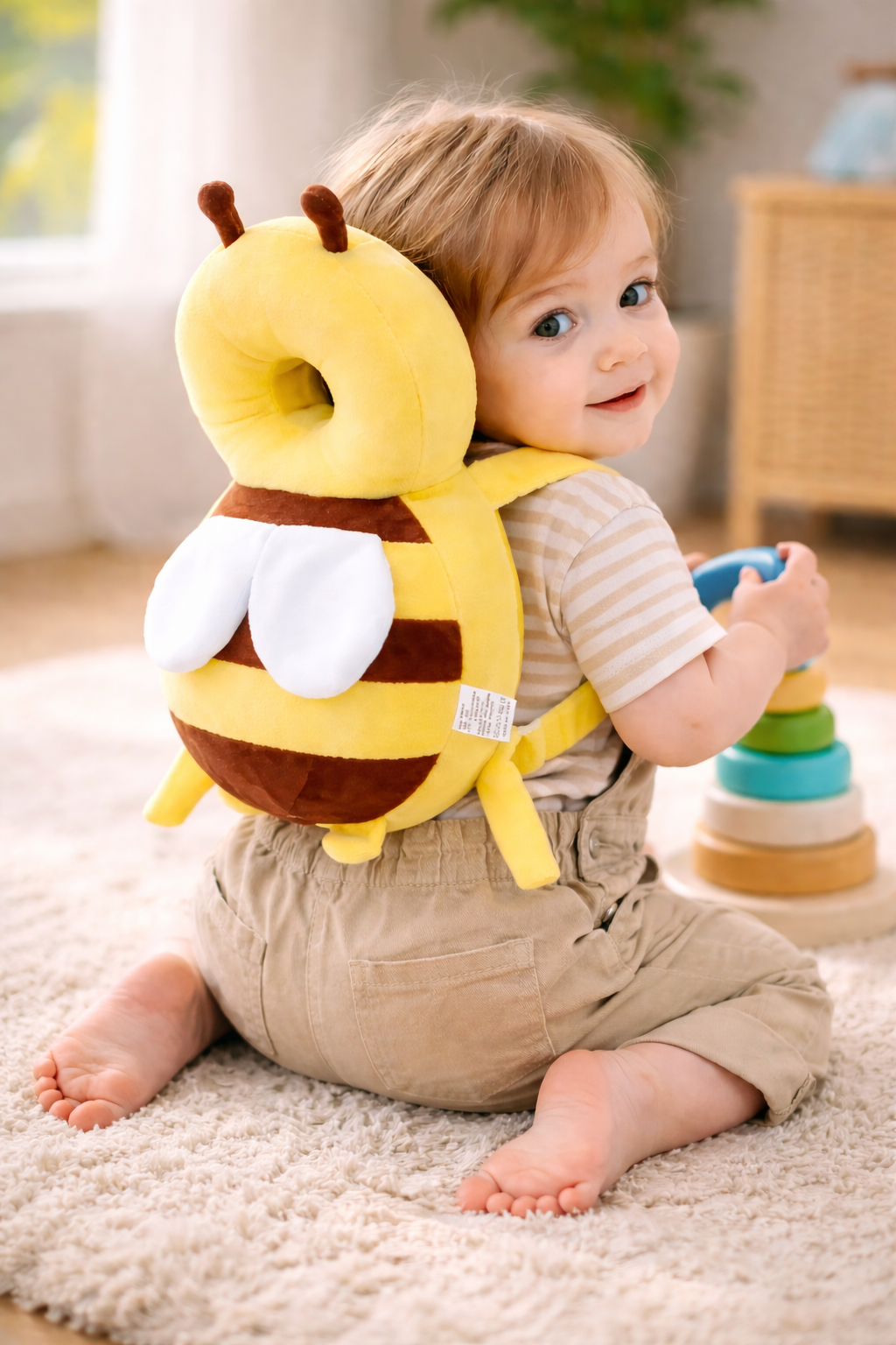 Ce coussin de protection en forme d’abeille absorbe les chocs si votre enfant tombe vers l’arrière.